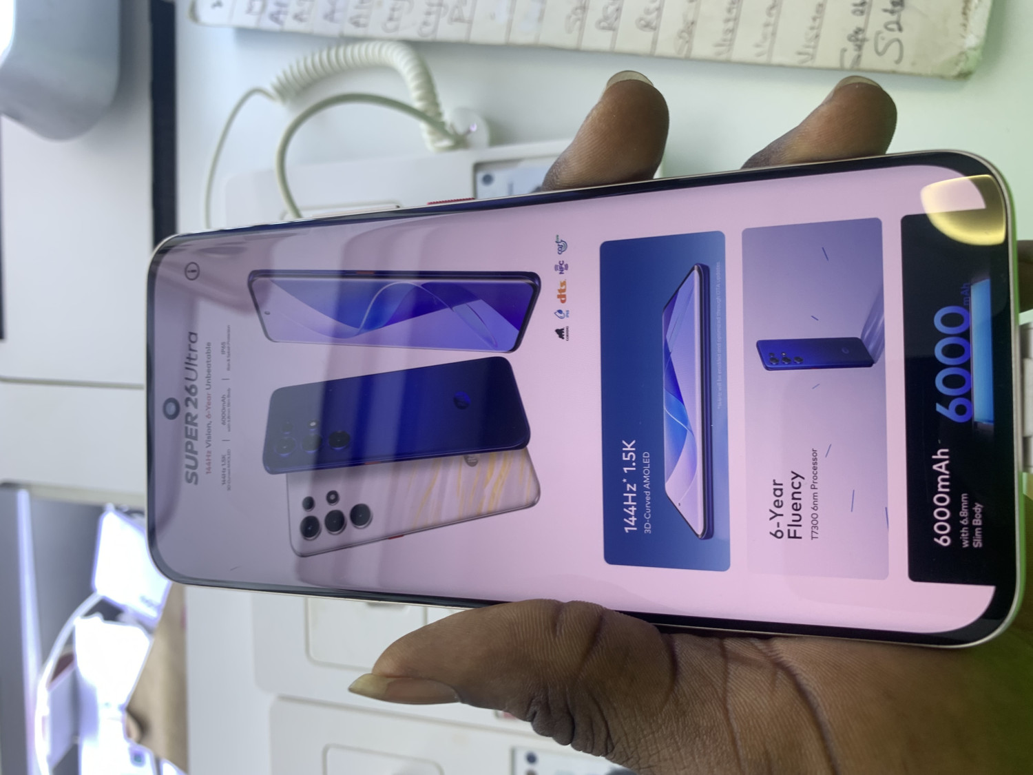 The itel Super 26 Ultra is a smartphone featuring a large 6.78-inch 3D-curved AMOLED display with a 144Hz refresh rate and Gorilla Glass protection. It is powered by a Unisoc T7300processor and a 6000mAh battery with 18W fast charging. Key features include a 50MP rear camera, 32MP front camera, 18W charging, and a slim 6.8mm design.