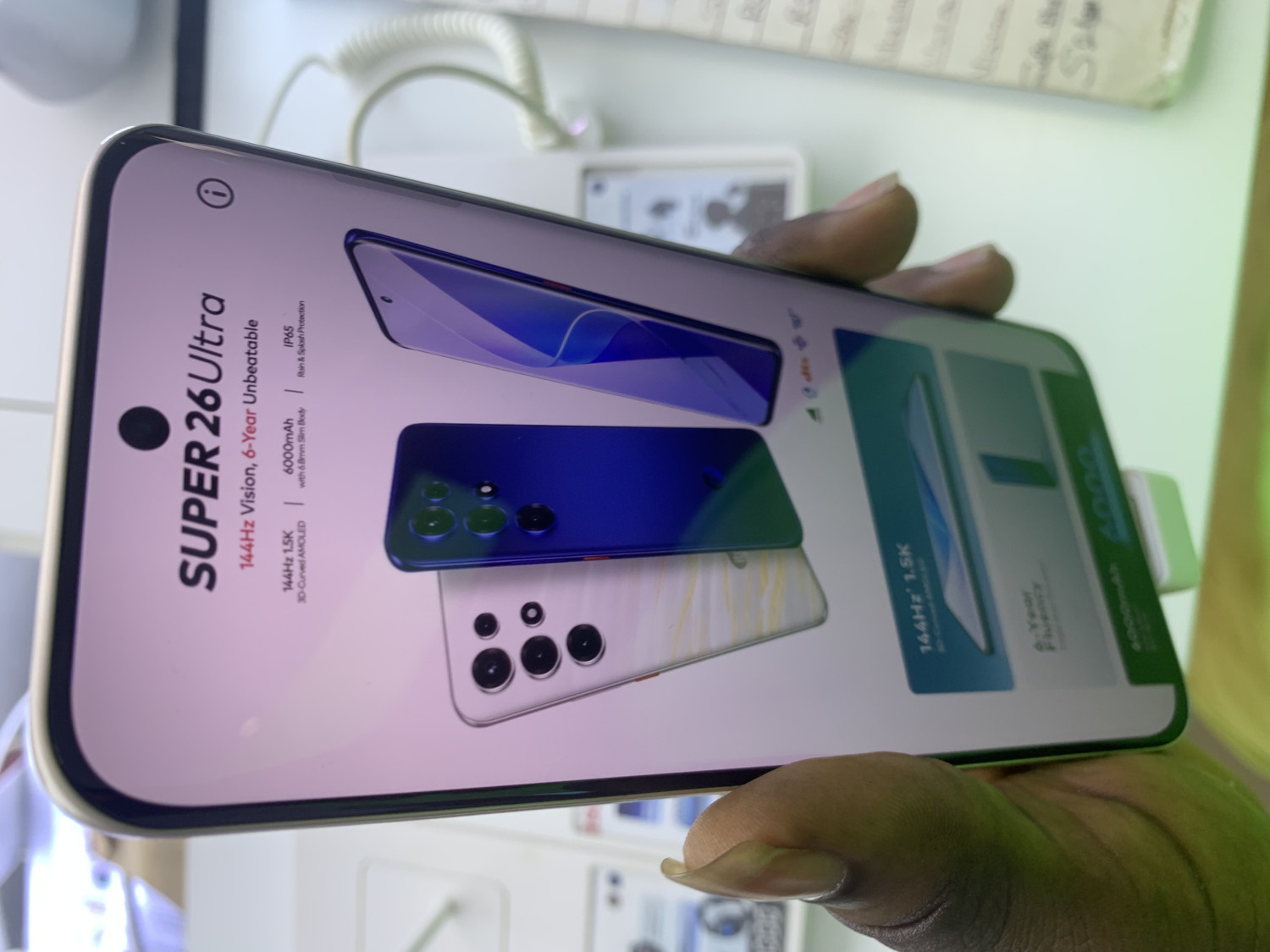 The itel Super 26 Ultra is a smartphone featuring a large 6.78-inch 3D-curved AMOLED display with a 144Hz refresh rate and Gorilla Glass protection. It is powered by a Unisoc T7300processor and a 6000mAh battery with 18W fast charging. Key features include a 50MP rear camera, 32MP front camera, 18W charging, and a slim 6.8mm design.